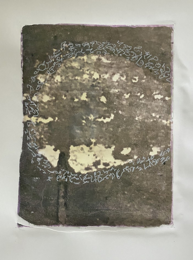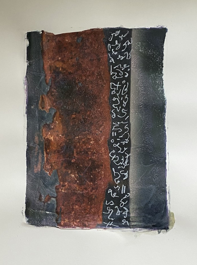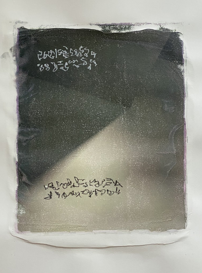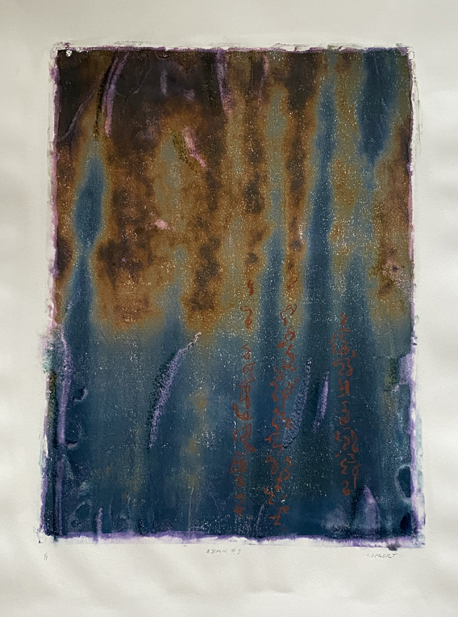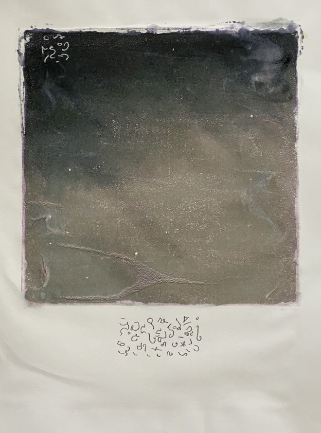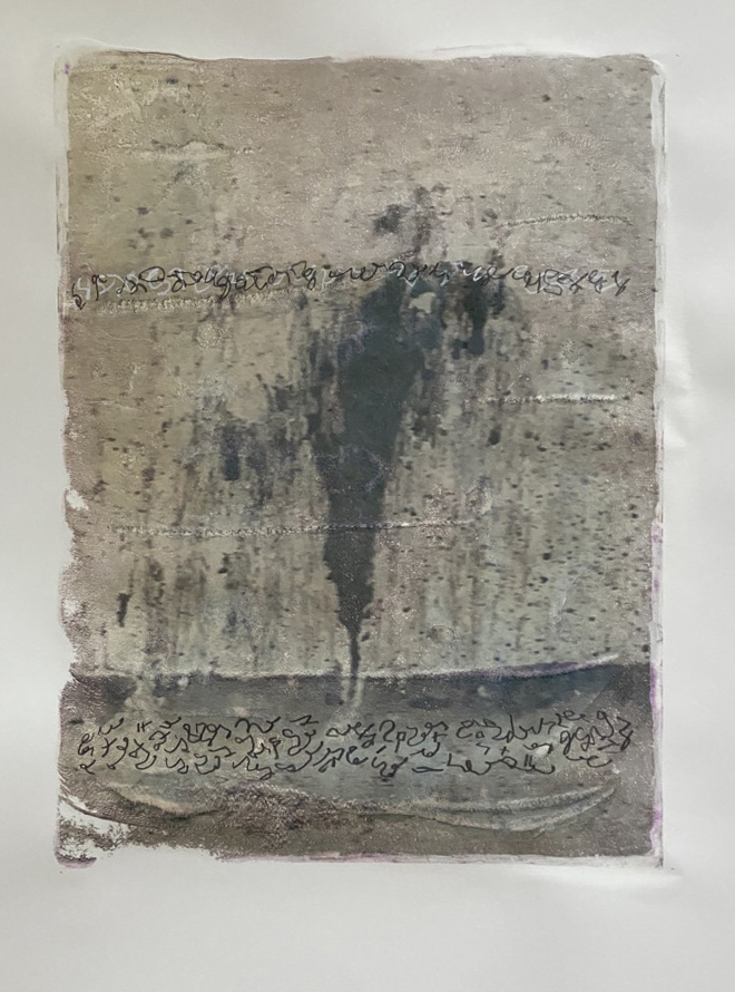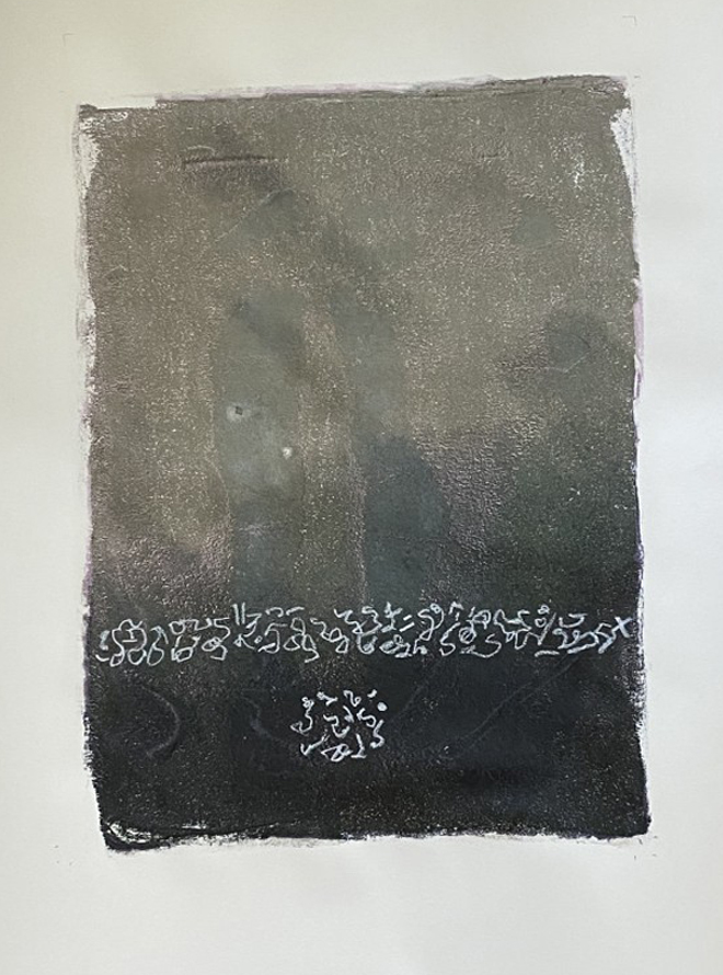The images are monographic photo transfers on printmaking paper with graphite, chalk or colored ink and pencil asemic writing. The larger images are roughly 12” x 17” framed at 18” x 25”. The asemic banners will be sized to be appropriate to the space. This exhibit is suggested for the Interactive Gallery.