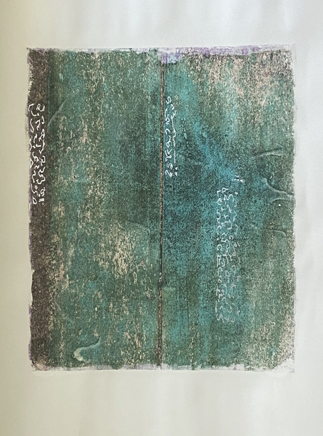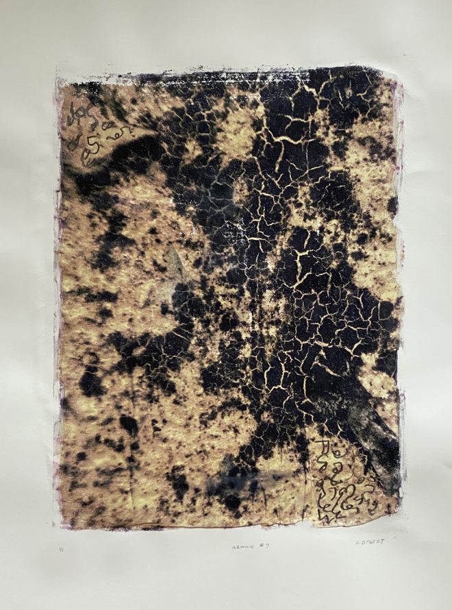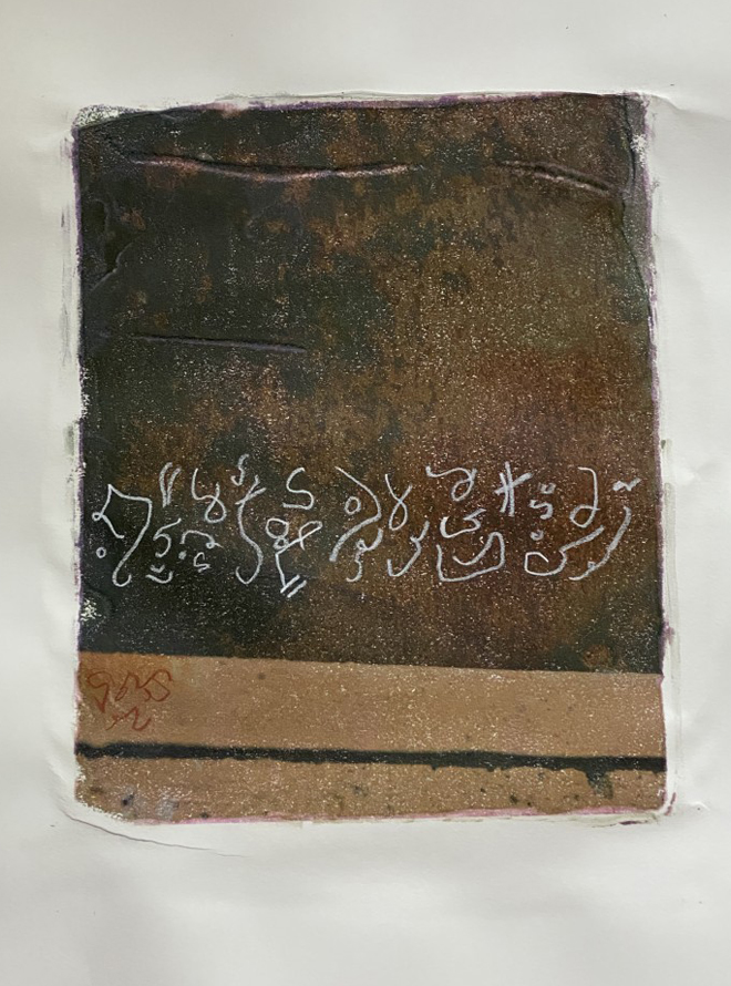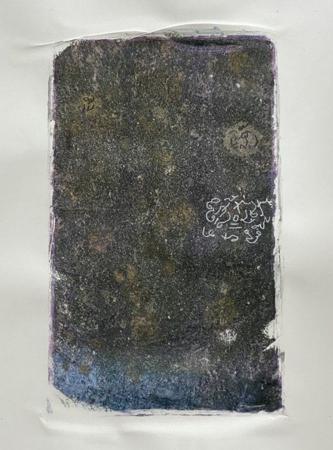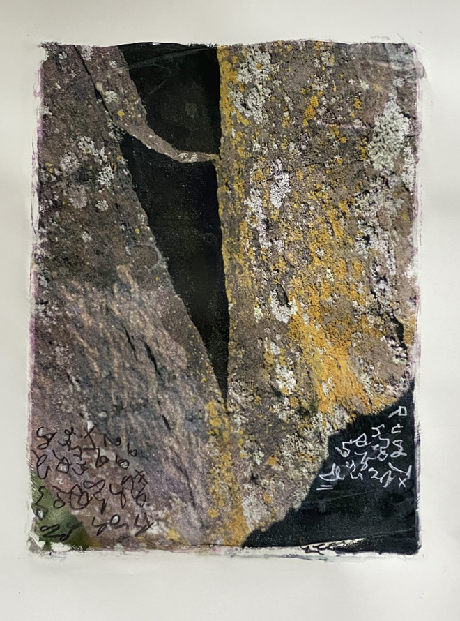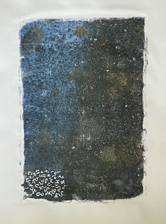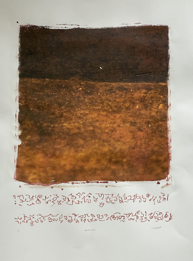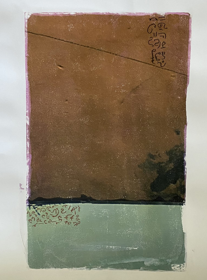 The images are monographic photo transfers on printmaking paper with graphite, chalk or colored ink and pencil asemic writing. The larger images are roughly 12” x 17” framed at 18” x 25”. The asemic banners will be sized to be appropriate to the space. This exhibit is suggested for the Interactive Gallery.